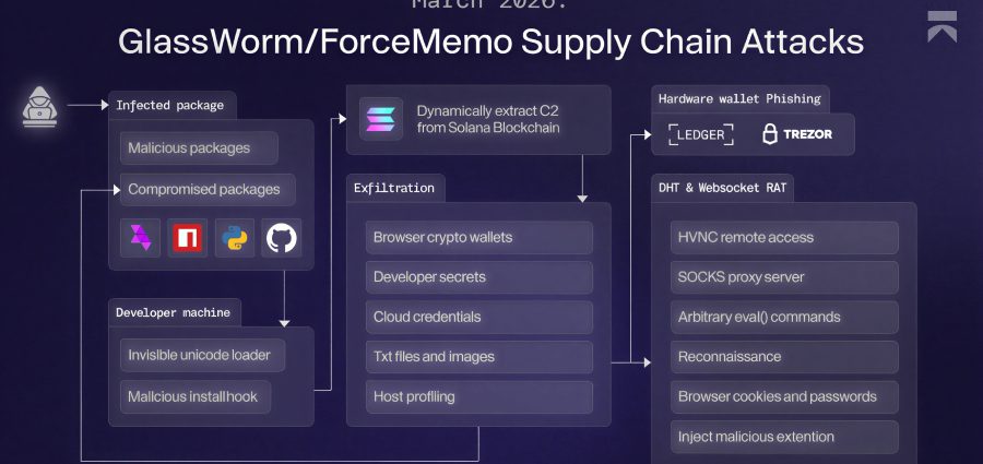 GlassWorm es el apodo asignado a una campaña persistente que obtiene un punto de apoyo inicial a través de paquetes maliciosos publicados en npm, PyPI, GitHub y el mercado Open VSX. Además, se sabe que los operadores comprometen las cuentas de los mantenedores del proyecto para enviar actualizaciones envenenadas.